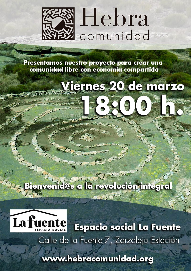 Siguiendo la ronda de presentaciones de este año, muy cerca ya de alcanzar el objetivo de conseguir una fina en propiedad en la que poner en marcha la Comunidad, os invitamos a una nueva charla sobre nuestro proyecto en Zarzalejo.